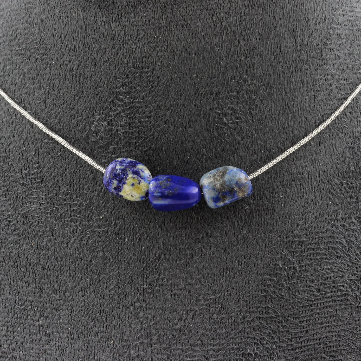 Lapis Lazuli from Pakistan 3 beads necklace, stainless steel chain length 45 cm. We can make it to your length on request (price varies depending on the length of the necklace). Made in France in our A Bijoux workshop. Delivered in a box pouch. Necklace for women, men, children. Discover more than 1000 models of necklaces made by the A Bijoux brand.